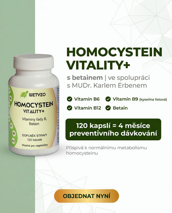 Homocystein Vitality+ s betainem je doplněk stravy vytvořený na základě spolupráce s MUDr. Karlem Erbenem a Mgr. Michaelou Verde Beitlovou, který díky vitamínům B6, B9, B12 a betainu přispívá  k normálnímu metabolismu homocysteinu.