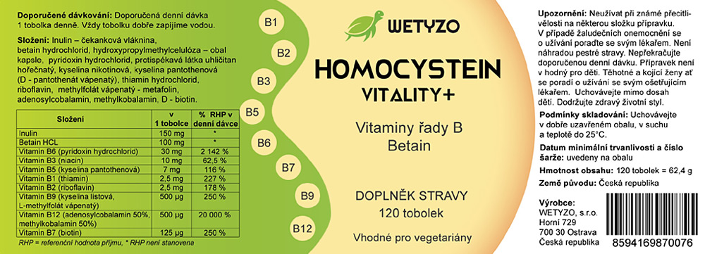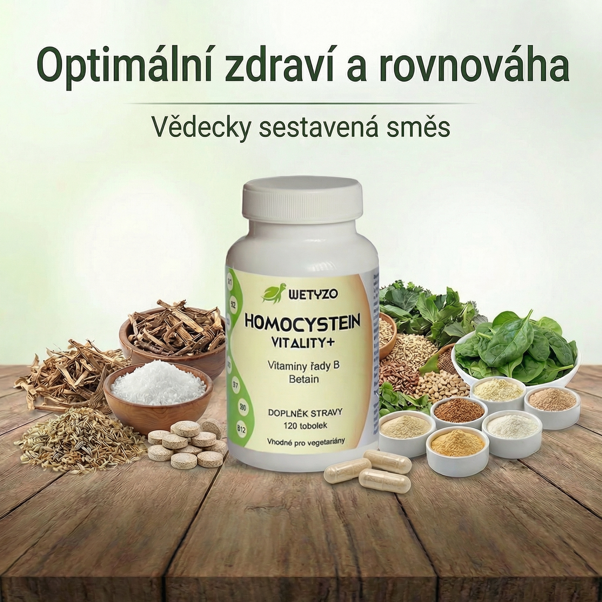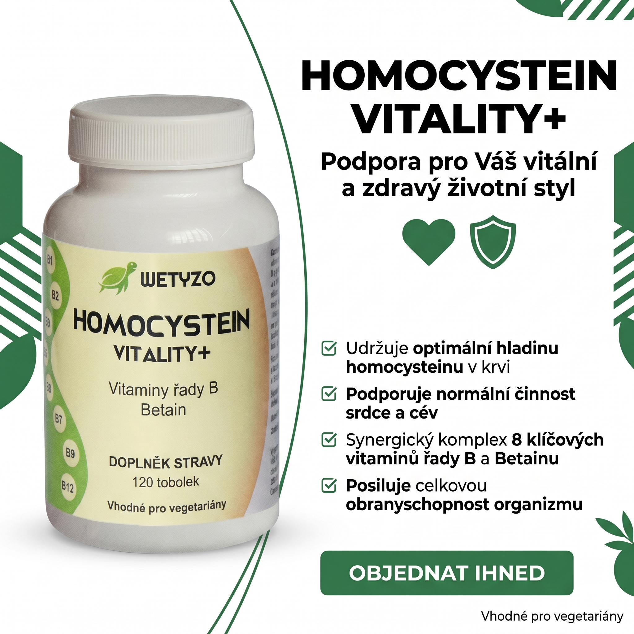 Homocystein Vitality+ s betainem je doplněk stravy vytvořený na základě spolupráce s MUDr. Karlem Erbenem a Mgr. Michaelou Verde Beitlovou, který díky vitamínům B6, B9, B12 a betainu přispívá  k normálnímu metabolismu homocysteinu.